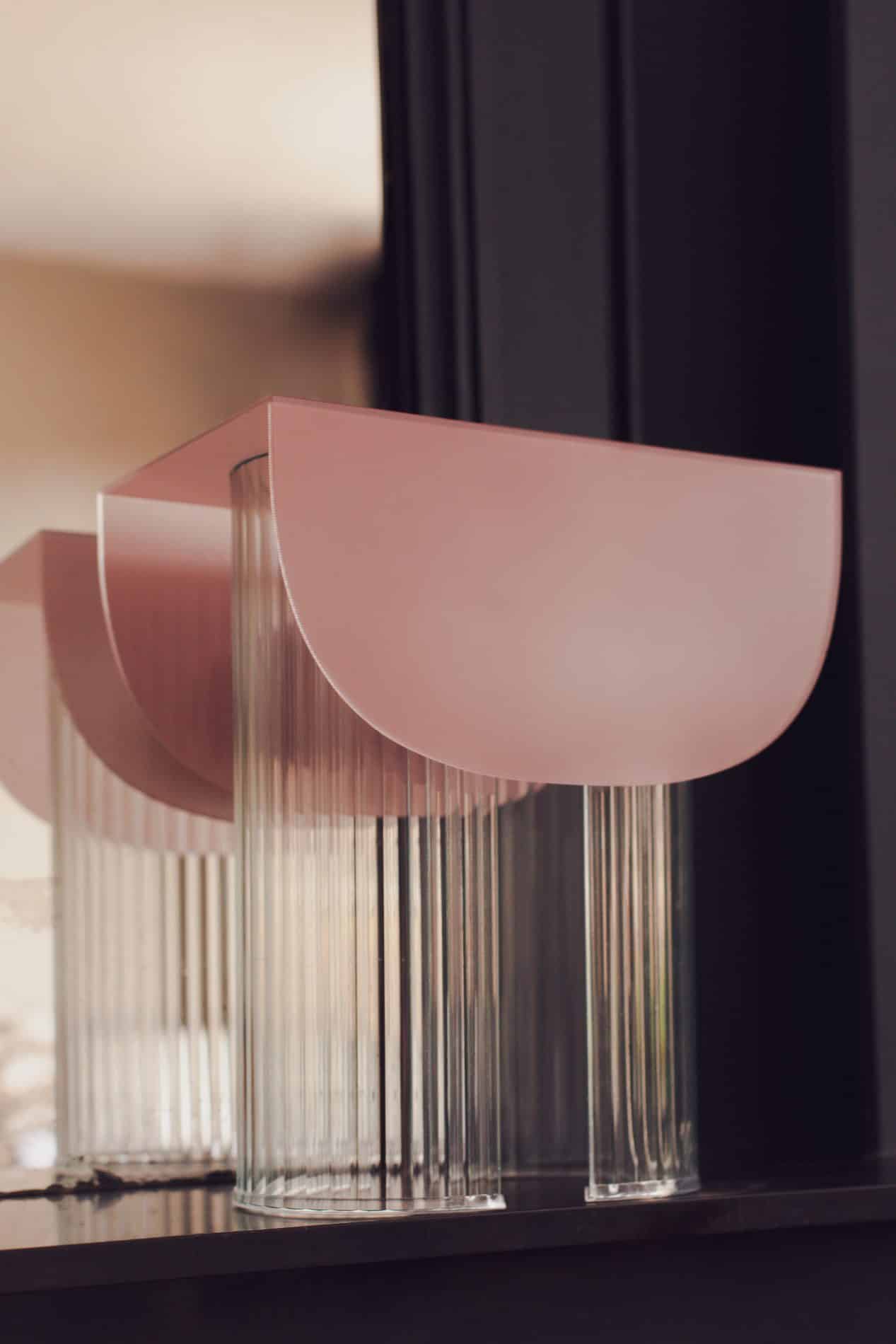 Pieds bombés en verre ondulé, coiffe en verre dépoli tramé rose, assemblage par collage UV