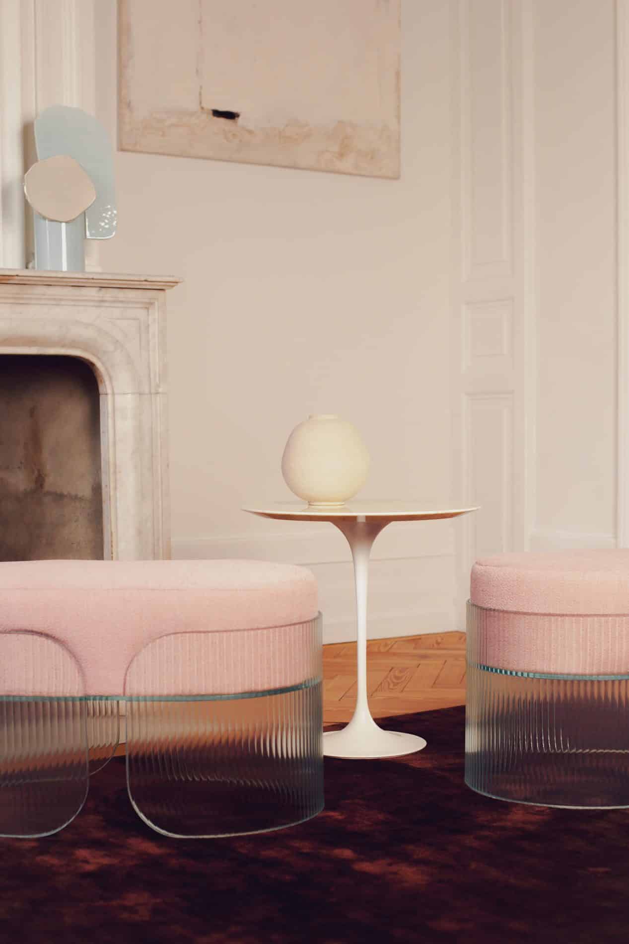 L’Ottoman Sublime (collection Bina Baitel 2022), du latin sublimis « qui va en s’élevant » ou « qui se tient en l’air » fait ici référence tant à l’impression de lévitation du coussin rehaussé par la transparence du verre, qu’à l’idée du sublime au sens de ce qui transcende le réel pour devenir objet d’émerveillement.