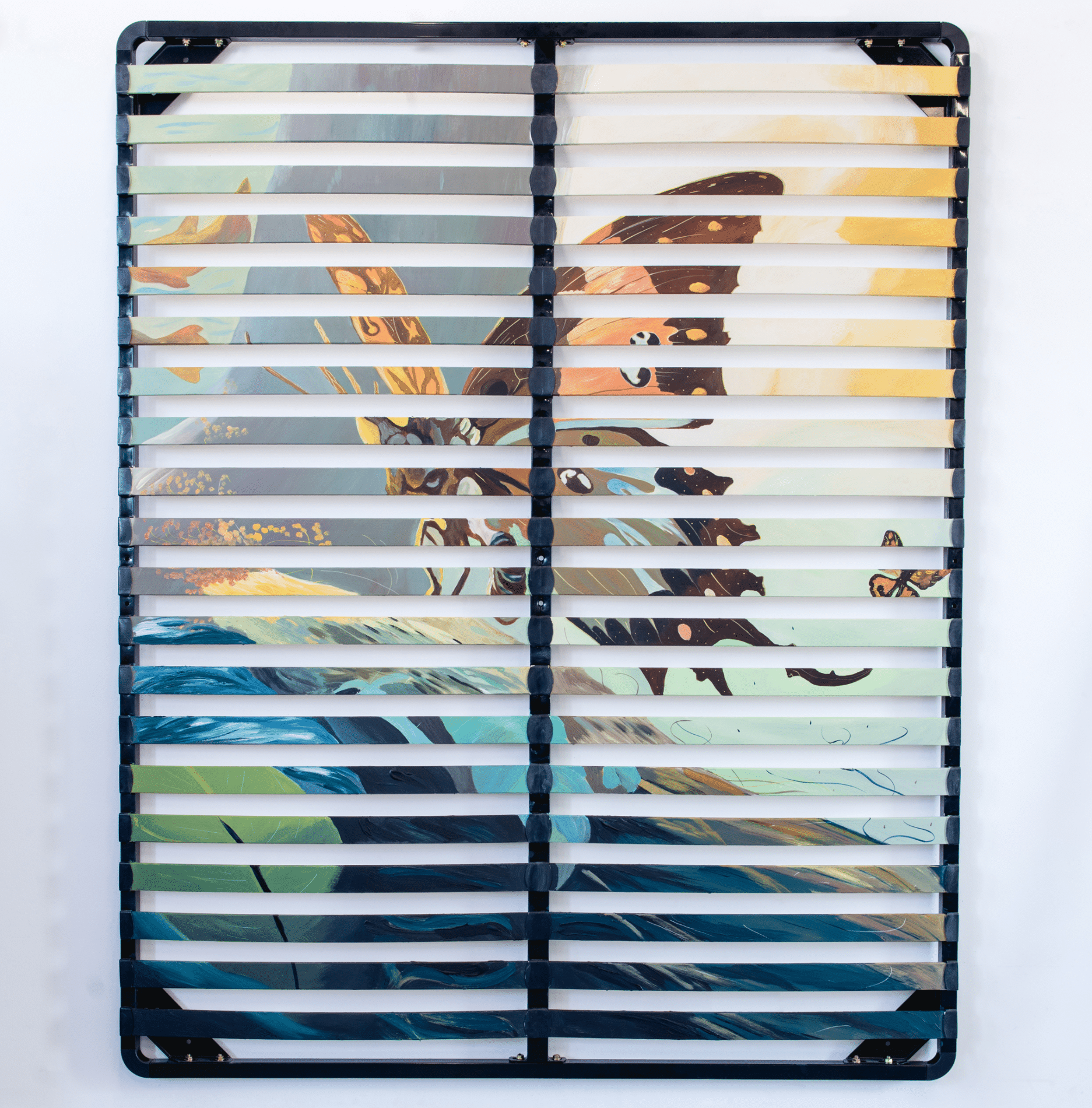 Dans sa série Berceau du Monde, des lattes de matelas sont disposées sur le sol ou suspendues dans les airs. Le propos est impactant, l’effet de surprise inévitable.