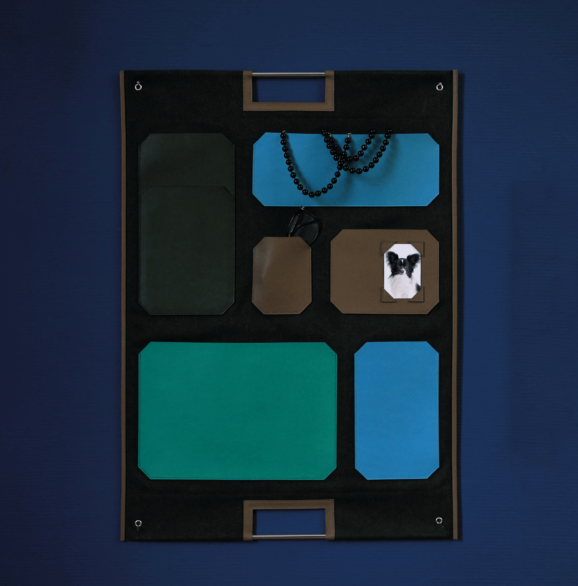 Le Tableau à Poches est une pièce unique qu’elle propose en trois versions colorées. Les pièces, fabriquées à côté de Tours, sont faites de coton et de cuir de veau pleine fleur, issu de grandes tanneries françaises.