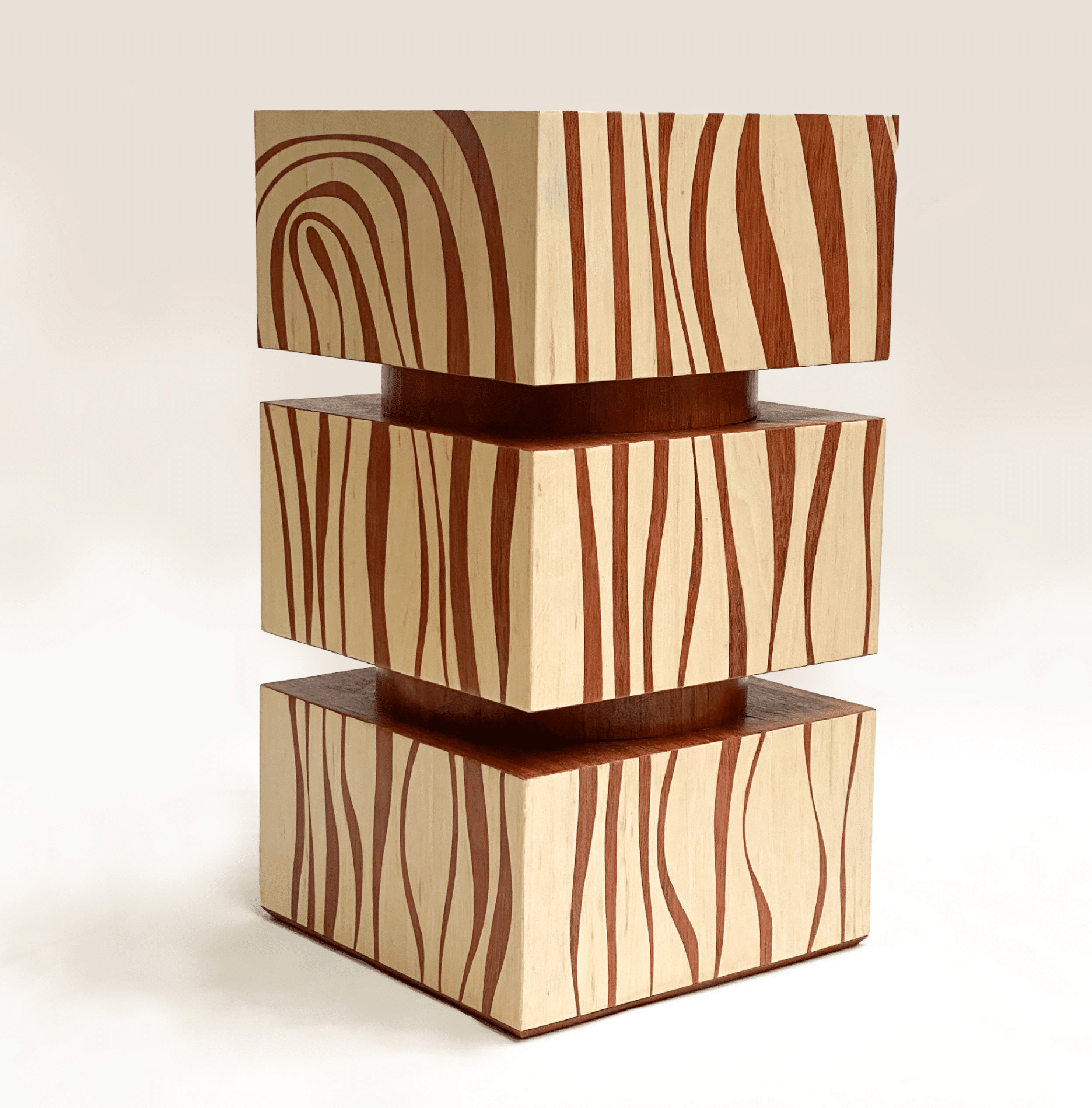 Assemblant manuellement des pièces découpées dans le respect du veinage du bois (bois de fil et de contrefil), le rythme du motif s’intègre au cœur de la matière. Par l’utilisation de rayures ou de motifs damiers, elle fusionne sa quête du mouvement avec une approche intuitive, se libérant des codes traditionnels la marqueterie, qui avait atteint son apogée au XVIIe et XVIIIe siècles en France.