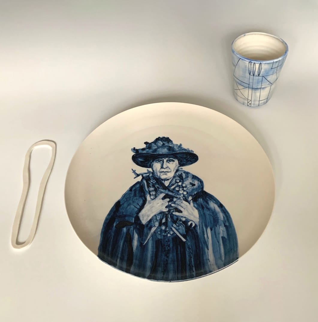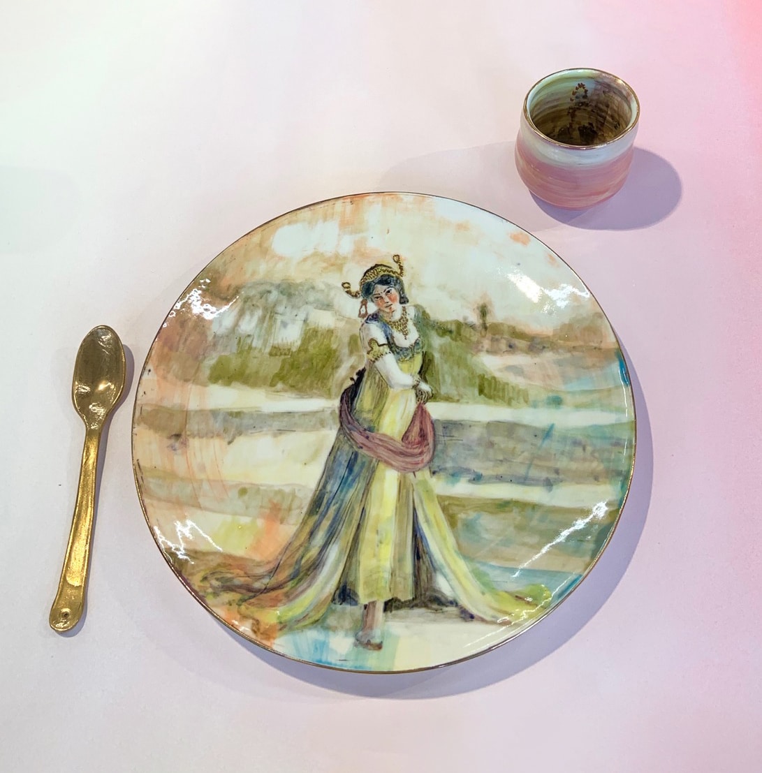 L’artiste offre son interprétation contemporaine de l’installation en dédiant une assiette à chaque femme artiste qui l’a touchée, inspirée, et qu’elle souhaite mettre en lumière. Ces portraits revisités sont ainsi peints sur de larges assiettes en porcelaine Audrey Blackman, tournées, peintes à la main et accompagnées d’une cuillère ainsi que d’un gobelet.