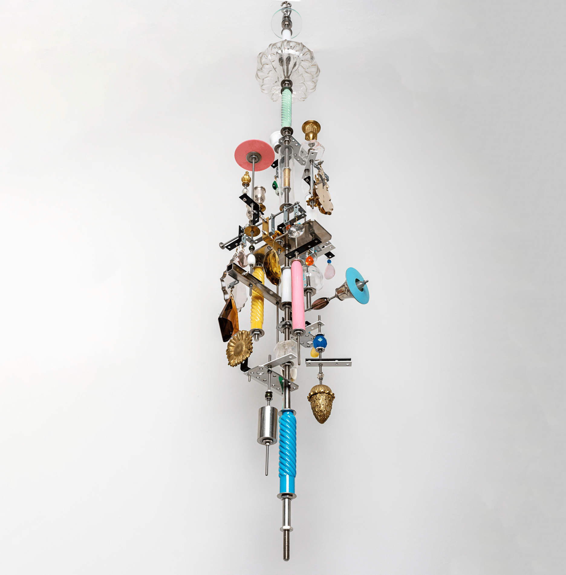 Le mariage du cristal, de l’opaline et du verre de Murano intrigue autant que l’alliance du fer, du bronze et du laiton. Un assemblage audacieux de formes et de boulons, pour une référence que l’on pourrait presque qualifier de steampunk… Tout y est pour faire des Inventions, ses compositions asymétriques et éclectiques, de véritables sculptures en suspension.