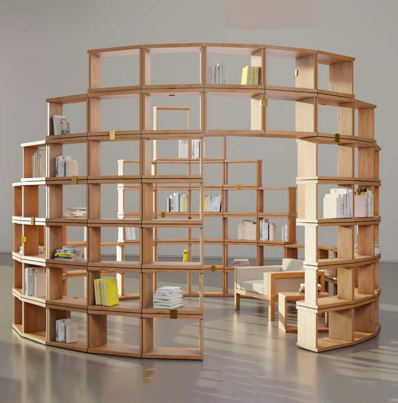 Vincent Lamouroux propose plusieurs formes/sculptures composées d’un certain nombre de modules, il imagine ainsi un propriétaire qui deviendrait « l’acteur de la forme qu’il choisit de générer ». Elle peut en effet évoluer au fil du temps, prenant parfois le rôle d’assise. Comme un rempart rassurant, la bibliothèque offre au lecteur un lieu propice au silence et à la circulation des idées.