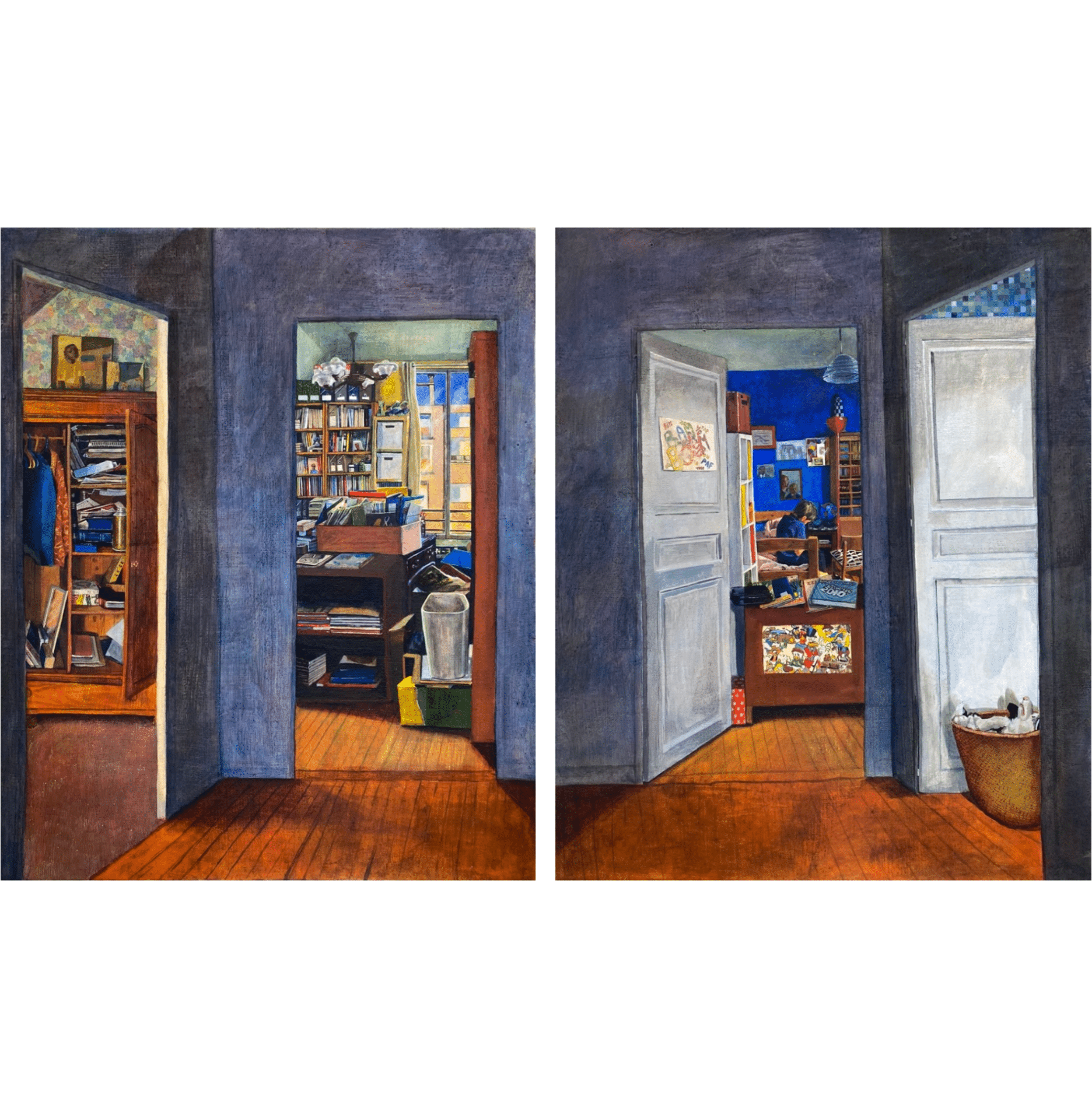 Dans son diptyque Croisement, présenté lors de l’édition 2023 de Private Choice, le cadrage place le spectateur dans le couloir d’un appartement, point central du foyer où la jonction des univers se fait. Alors que l’une des ouvertures laisse entrevoir une salle de bain, deux autres portes mènent vers les chambres de deux individus, dont le décor trahit les goûts et habitudes.