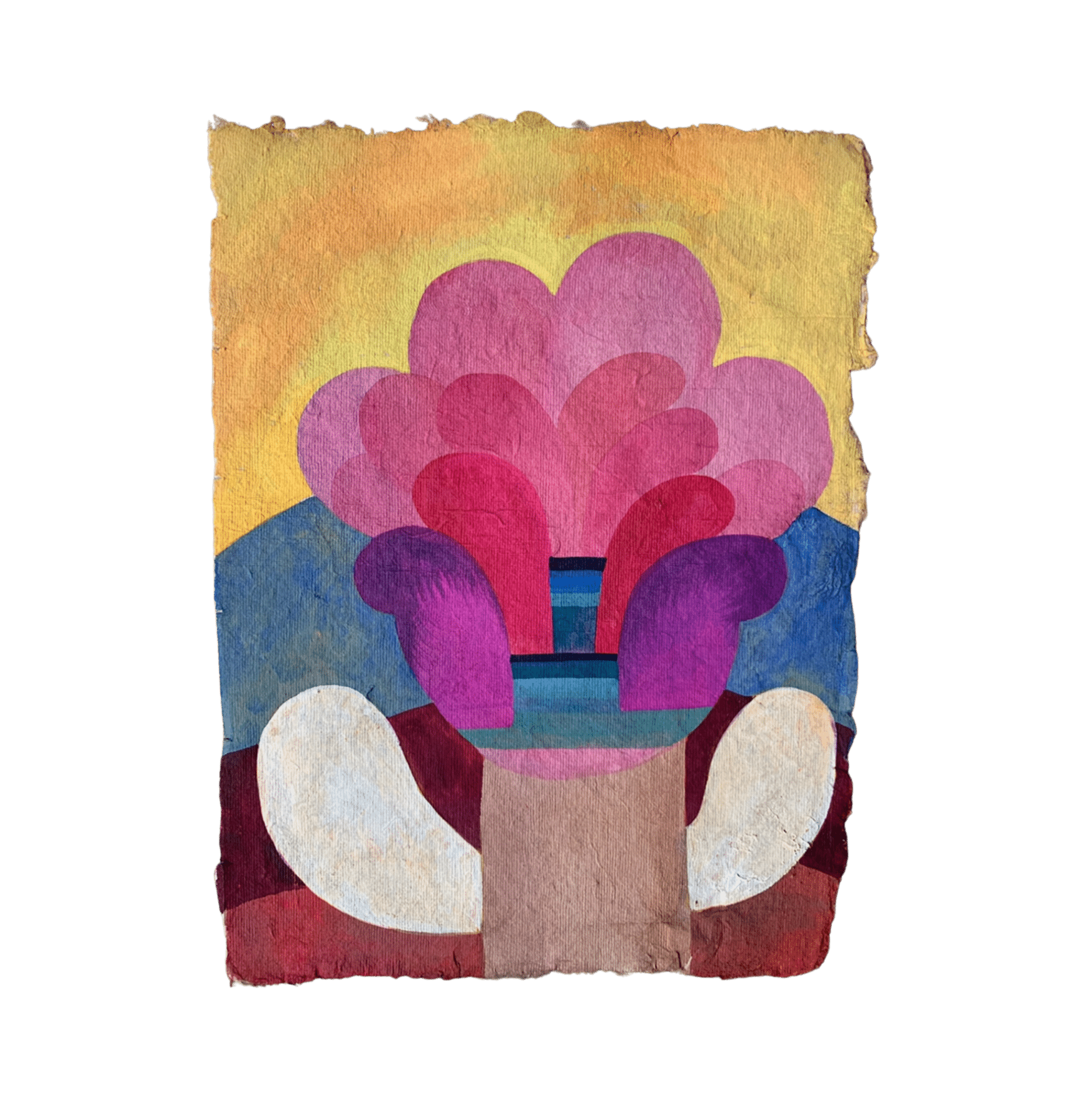 Les Fleurs, série emblématique de Caroline Rennequin, sont des gouaches sur papiers indiens, support chargé d’histoire pour l’artiste. Cette série colorée, sans tracé préalable, repose sur un principe d’harmonie et d’équilibre qu’elle nomme « variation ». L’artiste compare les formes à des flocons de neige, reconnaissables et uniques. Esthétiquement, les Fleurs synthétisent diverses influences, des années 70 aux Comics, créant des formes « pneumatiques » qui s’apparentent à des abstractions conceptuelles plus qu’à des représentations florales.