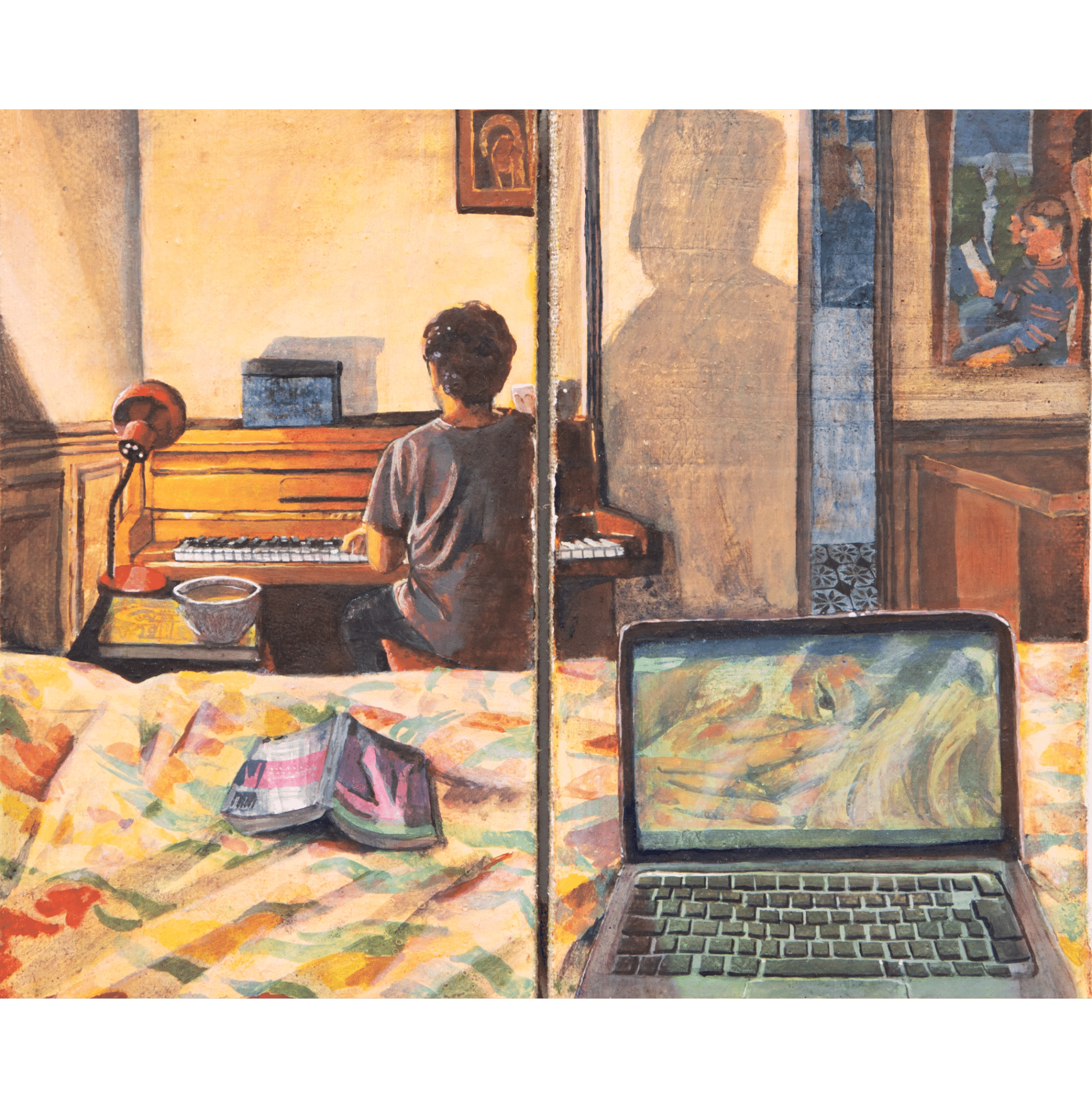 À travers ses petits formats, Louise Janet nous dévoile des parts de son histoire. Des personnages aux airs songeurs évoluent dans ses intérieurs familiers : loin de vouloir dresser le portrait de son entourage, l’artiste laisse cependant entrevoir une part de leur intériorité. La décoration d’une chambre, la manière désinvolte de laisser une couette défaite sur un lit, le « bordel organisé » qui jonche le sol… Chaque objet devient l’indice d’une personnalité et ouvre la voie à la narration.