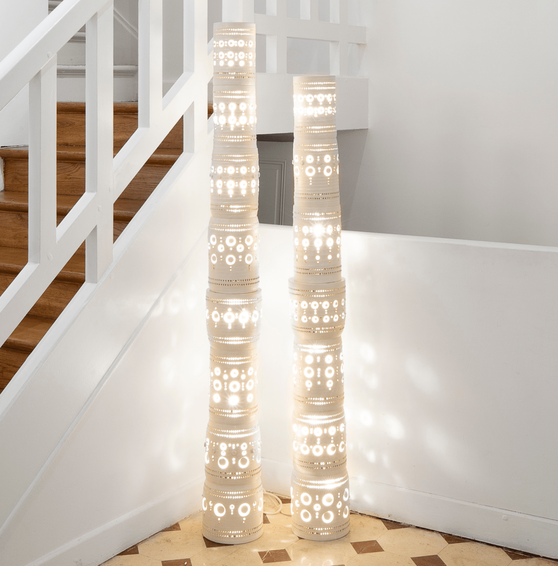 Pour l’édition de Private Choice 2024, un ensemble de miroirs, totems, lampadaires et de lampes sculpturales seront présentés. Ces pièces en céramique arborent les mêmes formes solaires : les luminaires ajourés prennent des allures de photophores et baignent la pièce d’une lumière douce, tandis que les miroirs surmontés de tiges en céramique émaillées, répondent à cette volonté de faire entrer les rayons du soleil dans un intérieur.
