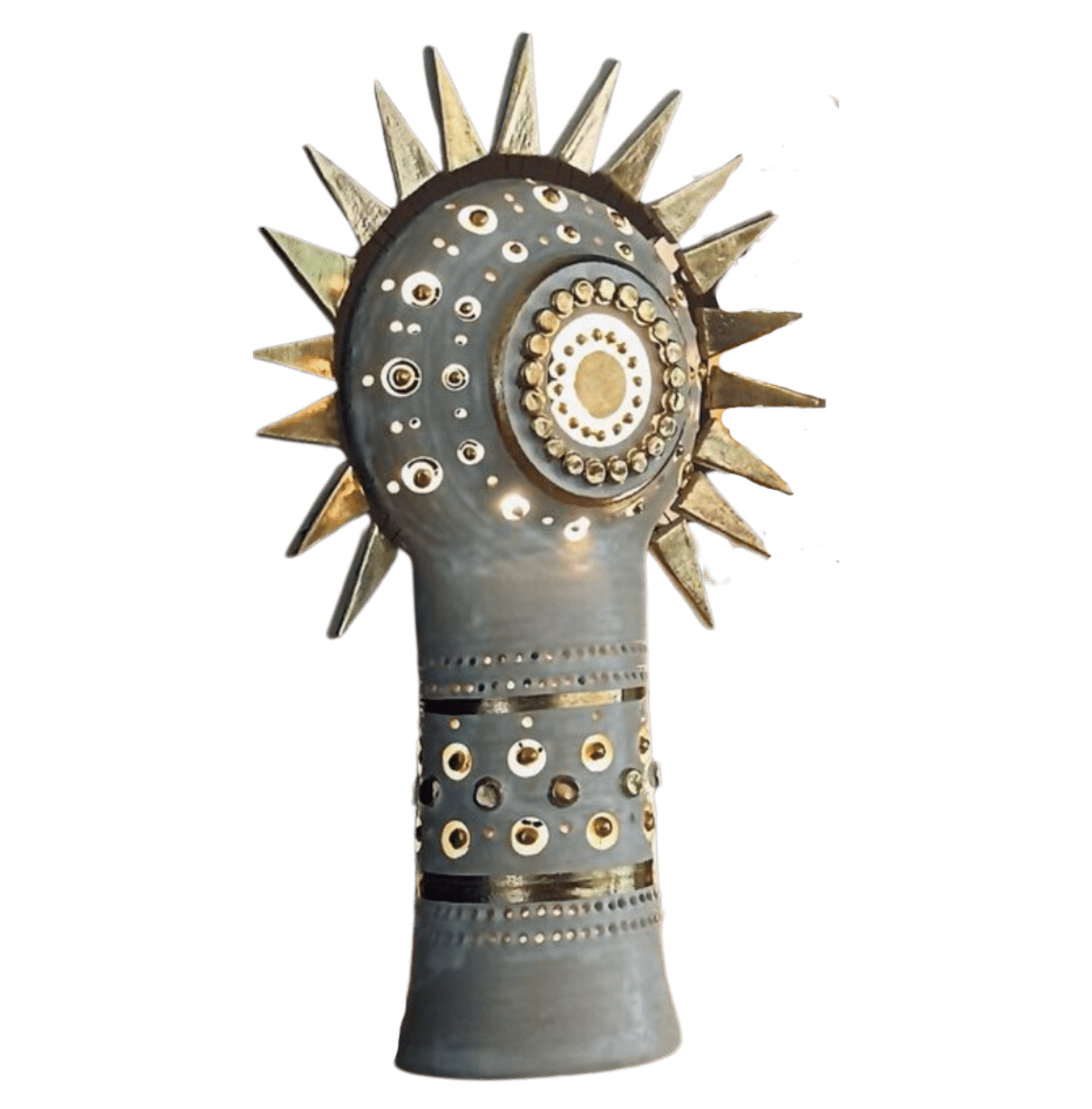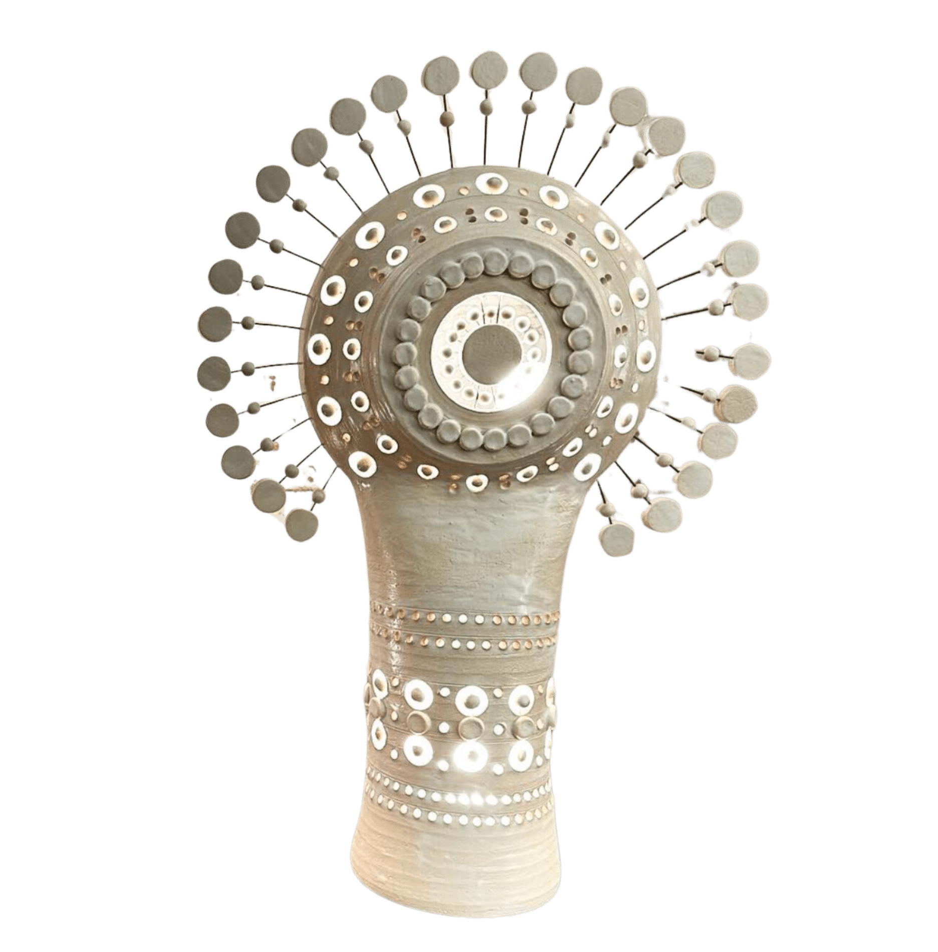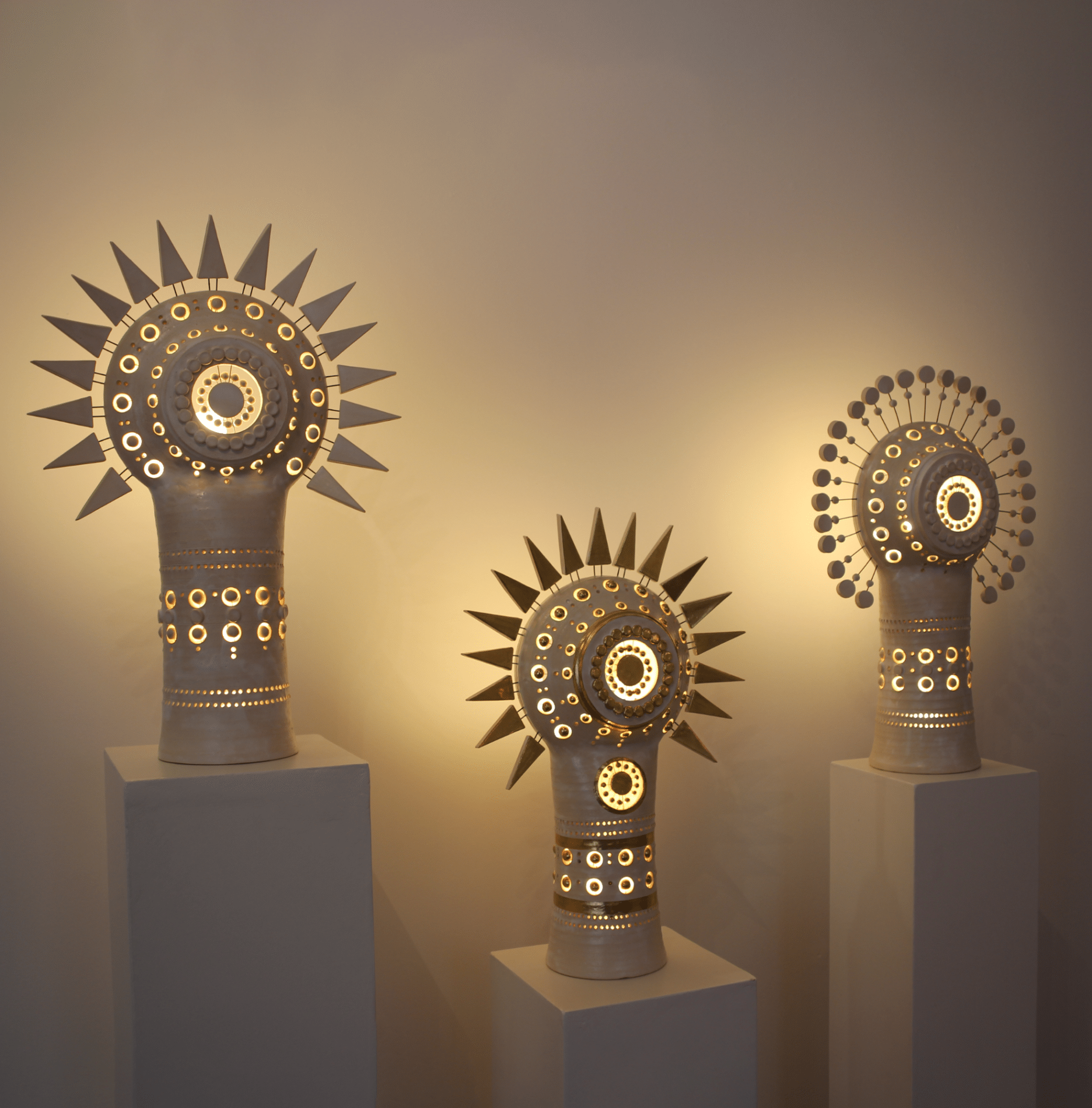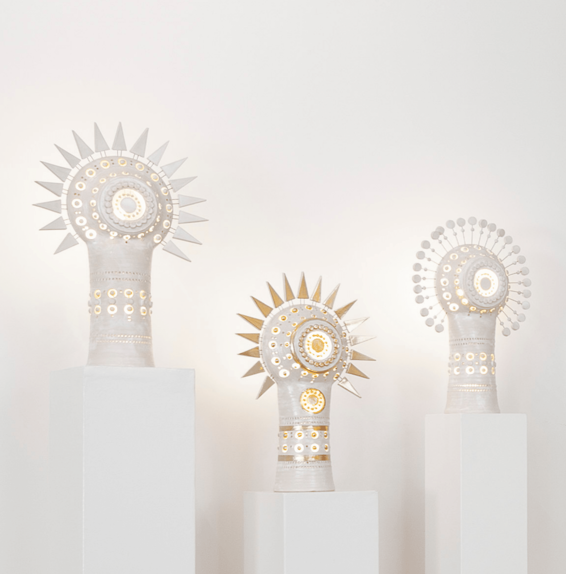 Pour l’édition de Private Choice 2024, un ensemble de miroirs, totems, lampadaires et de lampes sculpturales seront présentés. Ces pièces en céramique arborent les mêmes formes solaires : les luminaires ajourés prennent des allures de photophores et baignent la pièce d’une lumière douce, tandis que les miroirs surmontés de tiges en céramique émaillées, répondent à cette volonté de faire entrer les rayons du soleil dans un intérieur.