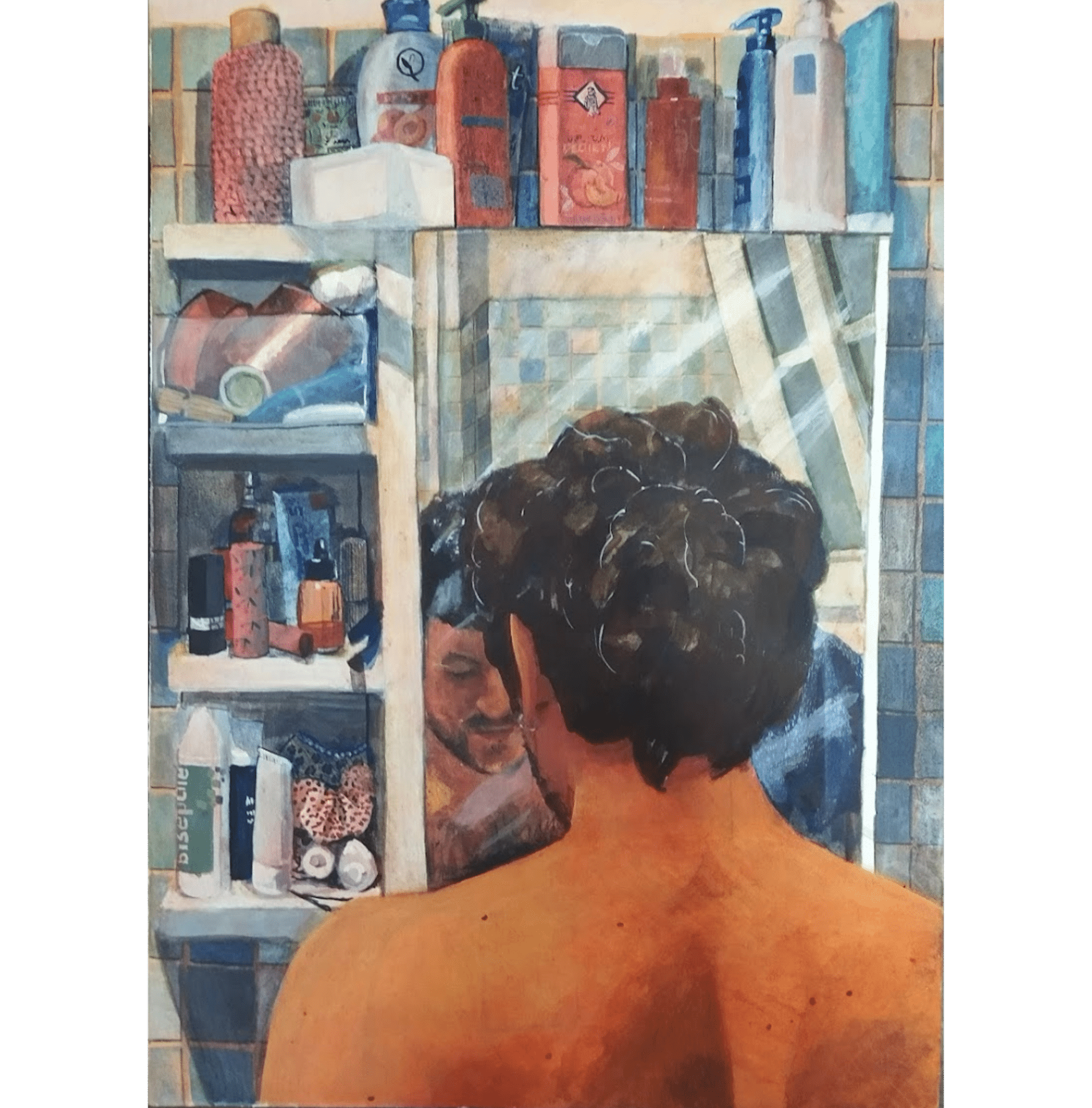 À travers ses petits formats, Louise Janet nous dévoile des parts de son histoire. Des personnages aux airs songeurs évoluent dans ses intérieurs familiers : loin de vouloir dresser le portrait de son entourage, l’artiste laisse cependant entrevoir une part de leur intériorité. La décoration d’une chambre, la manière désinvolte de laisser une couette défaite sur un lit, le « bordel organisé » qui jonche le sol… Chaque objet devient l’indice d’une personnalité et ouvre la voie à la narration.