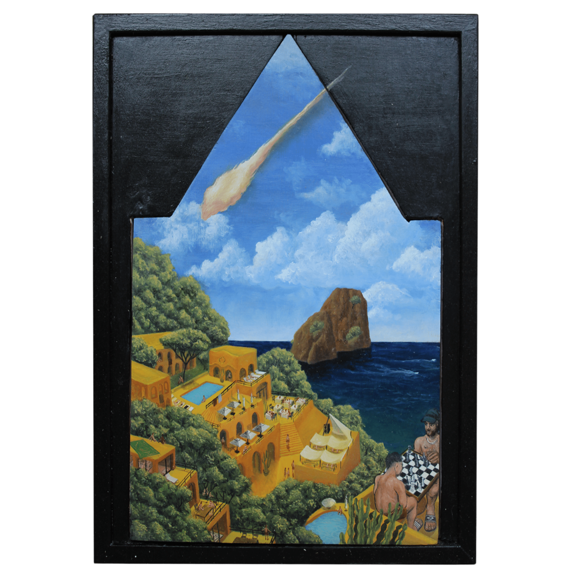 Sacha Cambier de Montravel a réalisé une série mettant à l’honneur la célèbre Villa Malaparte. Perchée à 32 mètres au-dessus de la mer sur le Capo Massullo, un rocher de l’île de Capri, l’artiste s’inspire des mythes et légendes qui ont forgé l’aura de cette demeure. Fondée par Curzio Malaparte, sa forme de boîte rouge pompéienne et ses lignes en font une icône de l’architecture moderne.