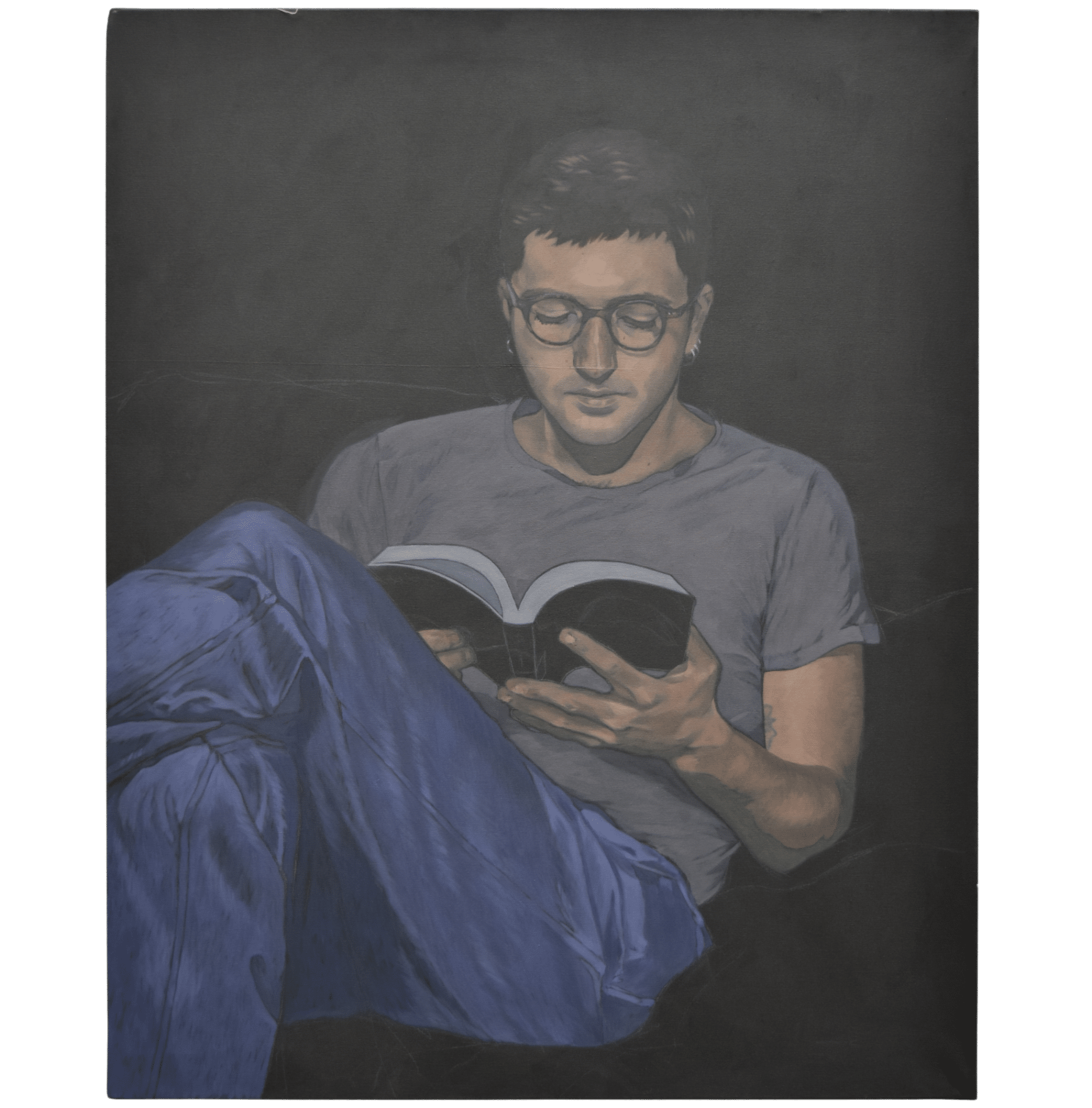 La peinture de Esther Imard se comprend comme un travail sur la lumière, à l’instar de la figure qui apparaît sur la pellicule photographique grâce à l’exposition lumineuse, ou de l’acteur qui surgit sur scène sous l’éclat du projecteur. Un fond noir mat, presque néant, constitue la base à partir de laquelle elle développe sa représentation. Par cette technique, la lumière émane du sujet même, donnant vie et substance à la figure.