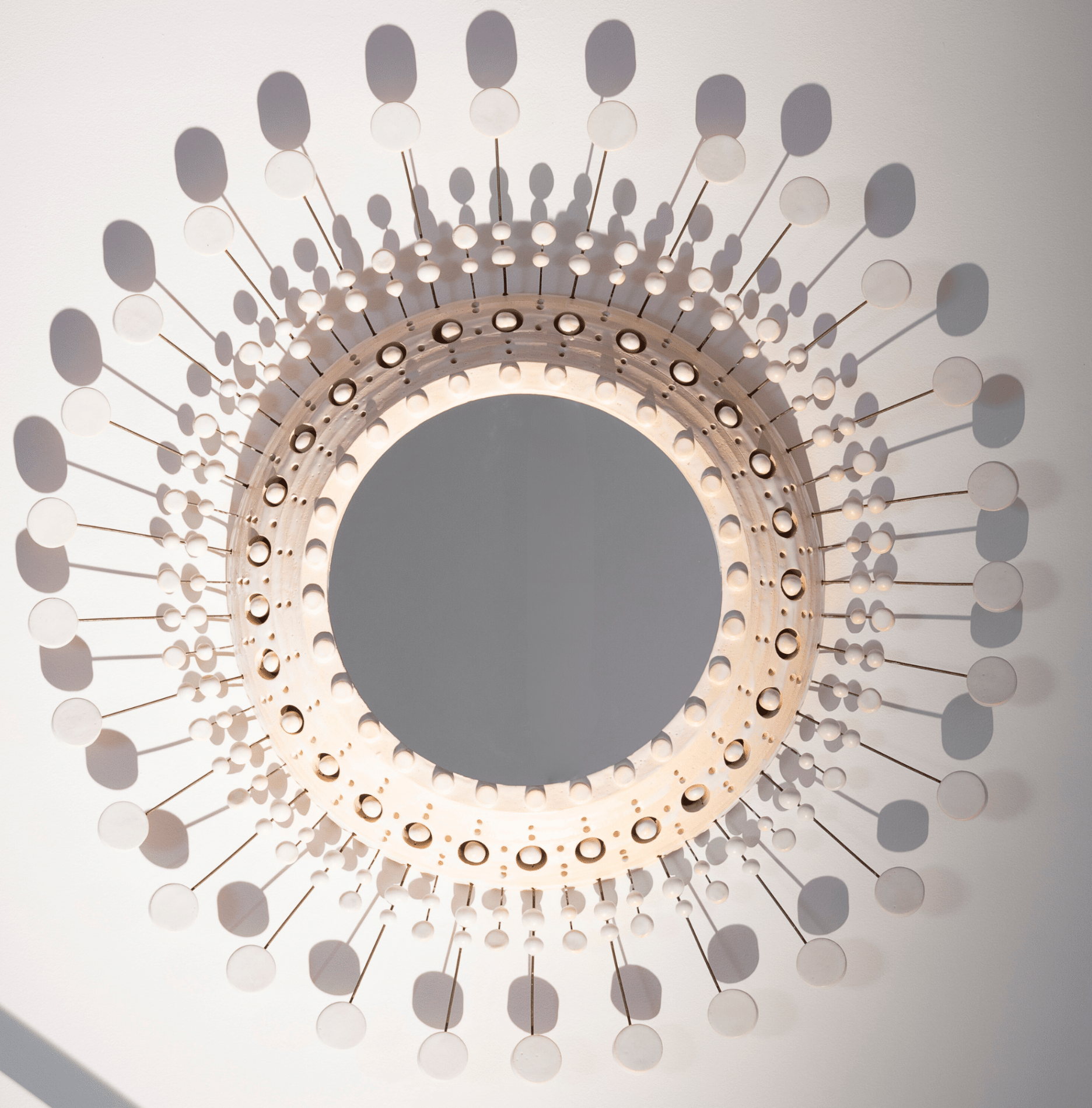 Pour l’édition de Private Choice 2024, un ensemble de miroirs, totems, lampadaires et de lampes sculpturales seront présentés. Ces pièces en céramique arborent les mêmes formes solaires : les luminaires ajourés prennent des allures de photophores et baignent la pièce d’une lumière douce, tandis que les miroirs surmontés de tiges en céramique émaillées, répondent à cette volonté de faire entrer les rayons du soleil dans un intérieur.