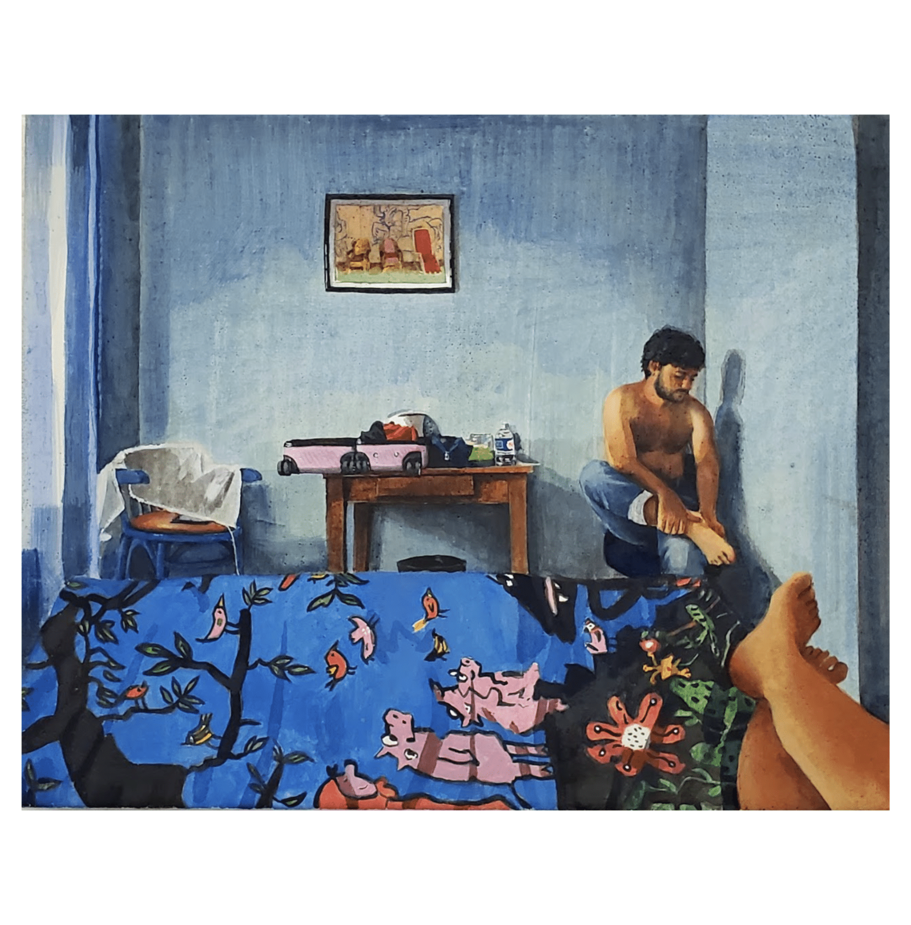 À travers ses petits formats, Louise Janet nous dévoile des parts de son histoire. Des personnages aux airs songeurs évoluent dans ses intérieurs familiers : loin de vouloir dresser le portrait de son entourage, l’artiste laisse cependant entrevoir une part de leur intériorité.