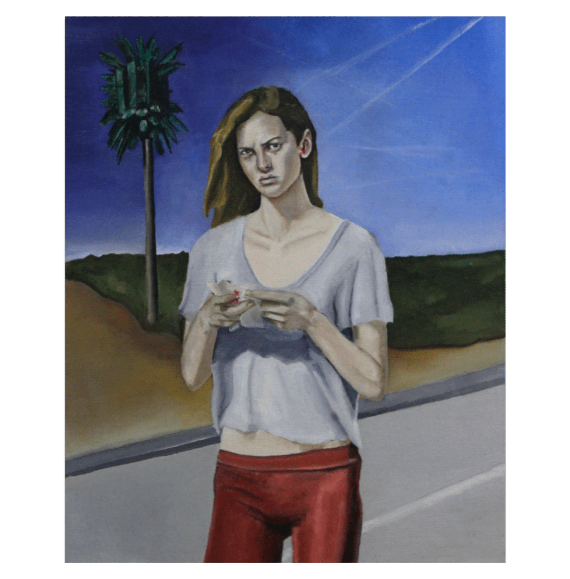 Cette peinture de Zoé Brunet-Jailly fait partie d’une série nommée R.P.G., sigle utilisé pour désigner un jeu de rôle où l’on incarne un personnage pouvant évoluer au fil d’une quête. Ici, dans ces peintures, nous incarnons une variation de Mathilde, amie devenue personnage, explorant un monde peuplé de mythes actuels et de complots. Il s’avère, par un heureux hasard, que son prénom signifie « la force dans la bataille ».