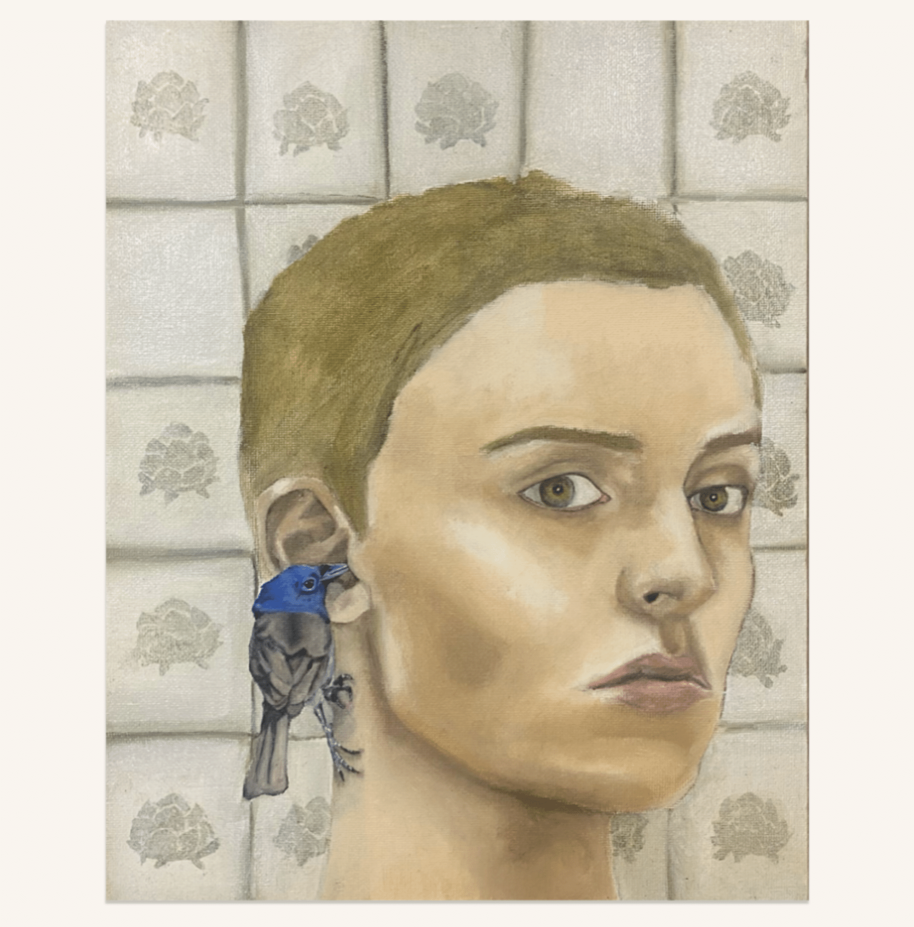 Cette peinture de Zoé Brunet-Jailly fait partie d’une série nommée R.P.G., sigle utilisé pour désigner un jeu de rôle où l’on incarne un personnage pouvant évoluer au fil d’une quête. Ici, dans ces peintures, nous incarnons une variation de Mathilde, amie devenue personnage, explorant un monde peuplé de mythes actuels et de complots. Il s’avère, par un heureux hasard, que son prénom signifie « la force dans la bataille ».