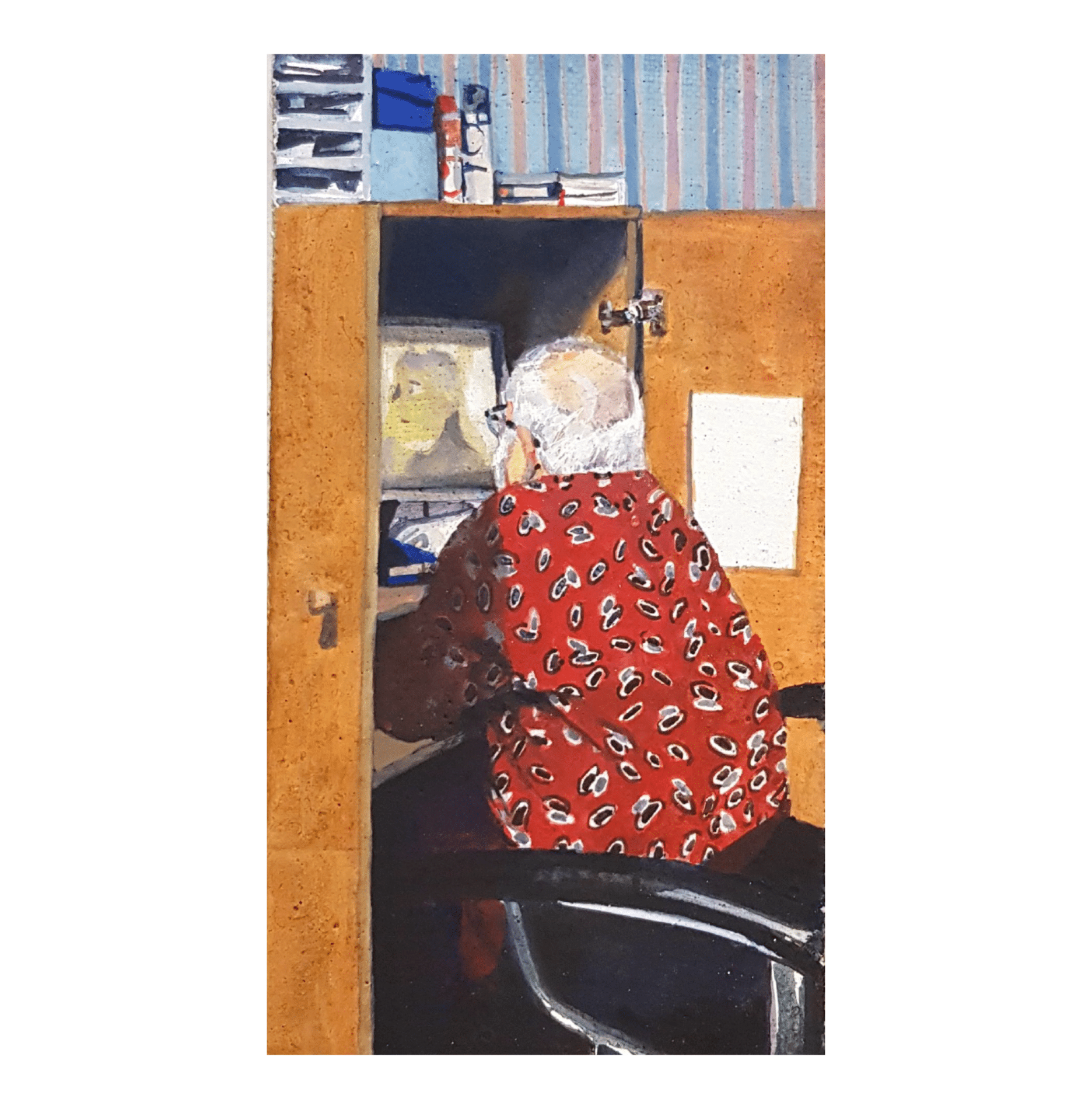À travers ses petits formats, Louise Janet nous dévoile des parts de son histoire. Des personnages aux airs songeurs évoluent dans ses intérieurs familiers : loin de vouloir dresser le portrait de son entourage, l’artiste laisse cependant entrevoir une part de leur intériorité.