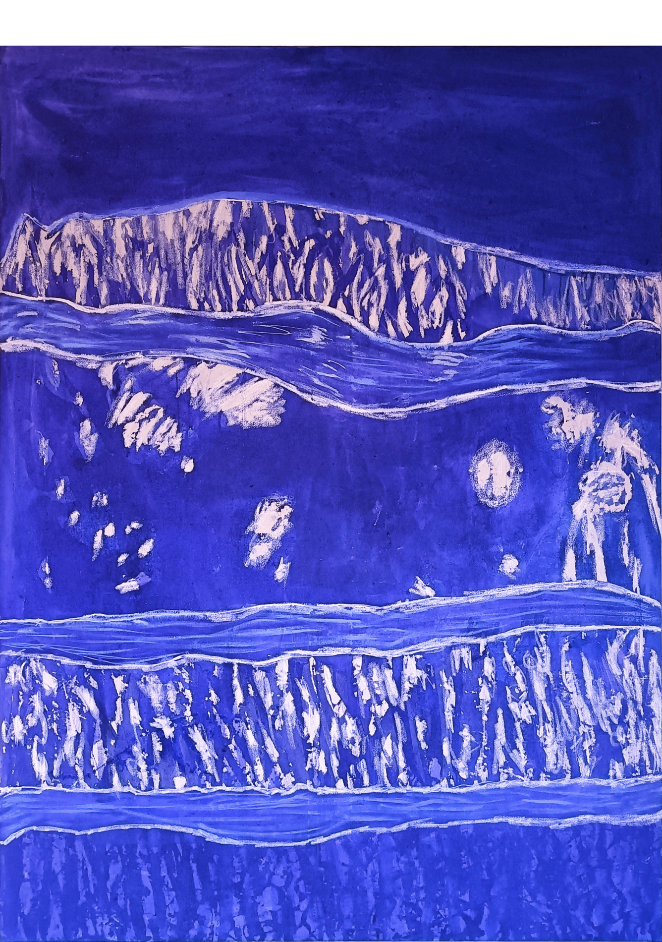Water Study est une métaphore autour de la symbolique de l’eau et de la notion du lien entre plusieurs éléments du cosmos et son infinie matérialité. Au départ, la peinture choisi sa trajectoire, les couleurs s’entrecroisent et composent un univers flottant.