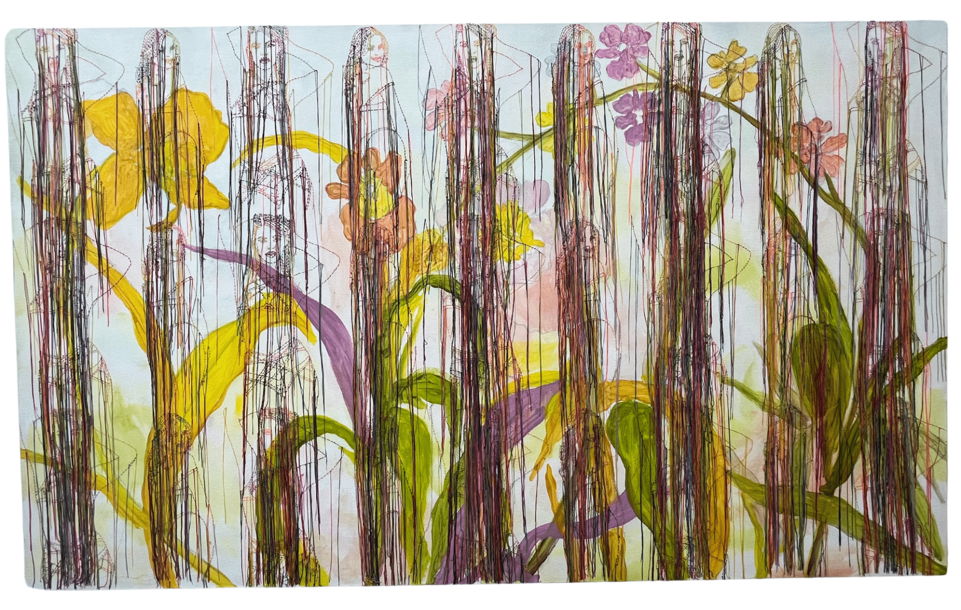 En 2024, c’est le côté engagé, parfois provocateur de la broderie, qui est mis en avant. Par un procédé long et fastidieux, parfois même douloureux, le geste devient performance. Les artistes tissent et brodent autour de sujets politiques : la technique, intrinsèquement liée à la féminité, met en exergue des cicatrices, renoue avec les mémoires porteuses de revendications identitaires. L’intérêt pour les gender studies et la mise en lumière des femmes artistes ces dernières cinq années est également à mettre en lien avec la forte présence de ce médium sur la foire. Alors que certaines œuvres brodées s’invitent dans un imaginaire plus onirique, utilisant les fils chamarrés et la douceur du textile pour se rapporter à l’enfance, la plupart traitent des questions urgentes comme la migration, la déforestation, les rapports de domination envers les femmes ou les personnes racisées.